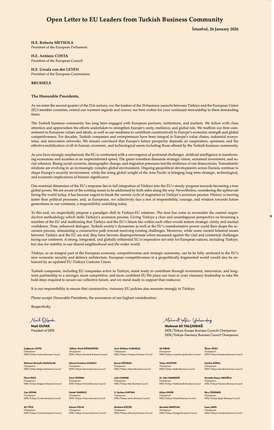 Türk iş dünyası, Dış Ekonomik İlişkiler Kurulu (DEİK) bünyesinde AB ülkeleriyle karşılıklı olarak kurulmuş olan Türkiye-Avrupa İş Kurulları Başkanları ile DEİK Başkanı Nail Olpak ve DEİK Avrupa İş Konseyleri Koordinatör Başkanı Mehmet Ali Yalçındağ’ın imzasını taşıyan bir mektupla Avrupa Birliği (AB) başkanlarına Türkiye-AB bağlarında “paradigma değişimi” davetinde bulundu. AB’nin karşı karşıya olduğu sınamaların sıralandığı mektupta bu sınamalara en temel karşılıklardan birinin “Türkiye’nin AB’nin gerçek bir global güç olma yolundaki istikrarlı ilerleyişine tam entegrasyonu” olacağı vurgulandı. “Türkiye’nin iştirak sürecini tıkayan mevcut verimsiz prosedürün yine değerlendirilmesinin vakti gelmiştir,” denilen mektupta “Jeopolitik olarak parçalanmış bir dünyada Avrupa’nın rekabetçiliği, güncellenmiş bir AB–Türkiye Gümrük Birliği ile daha da güçlenecektir,” değerlendirmesine yer verildi. Mektup, Türk şirketlerinin bu süreçte katkı sunmaya hazır olduğu vurgulanarak “Ortak geleceğimizi garanti altına almak için gerekli mert adımları atacağınıza olan inancımız tamdır; bu efora takviye vermeye hazırız.” ifadeleriyle son buldu.